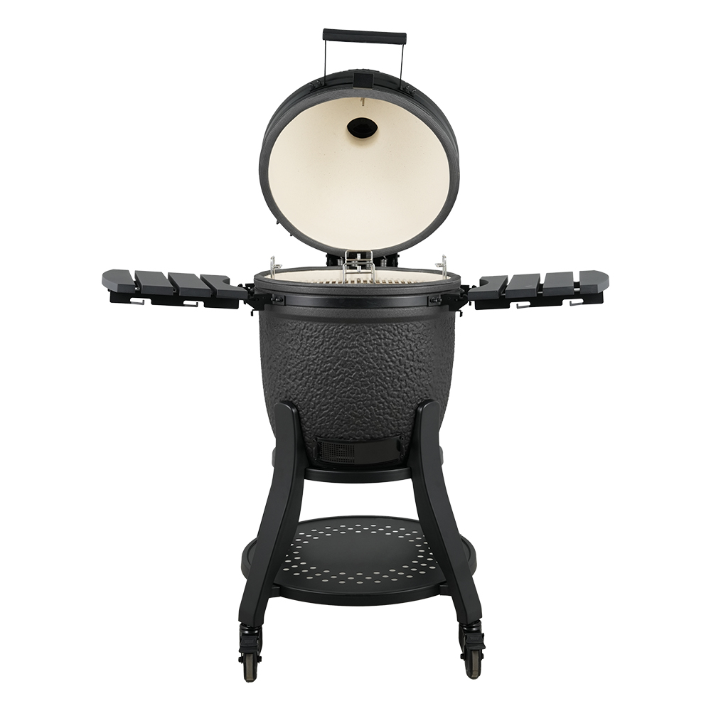 1. Special bubble glazing finish 2. Deluxe KJ stand with 4inch wheels 3. Cast aluminum side table, soft feeling plastic handle 4. Premium larger 80mm thermometer 5. Premium cast aluminum air vent 6. Black bottom went 7. Fiberseal gasket 8. Ceramic body with logo 9. Easy lift hinge system +locker Inside: 10. Duluxe divide conquer cooking system ( New 3 tirers system, 7mm thick square rod x2 half grid, x2 half moon double thick 24mm deflector,x2 half moon drip pan) 11. Double thick 24mmxlarger 380mm Diameter pizza stone 12. 1x cast iron half moon cooking grid, 1x cast iron half moon cooking plate 13. 6mm thick Charcoal basket with share +Ash drawer BBQ Accessories Pack: ( Total 58.4USD) 14. Chicken sitter with logo 15. Stainless steel pizza shovel with logo 16. Cleaning brush 17. Grill gripper 18. Cover with IQ GRILLS logo 19. Bluetooth Wireless digital thermometer 20. Black hot air charcoal lighter w