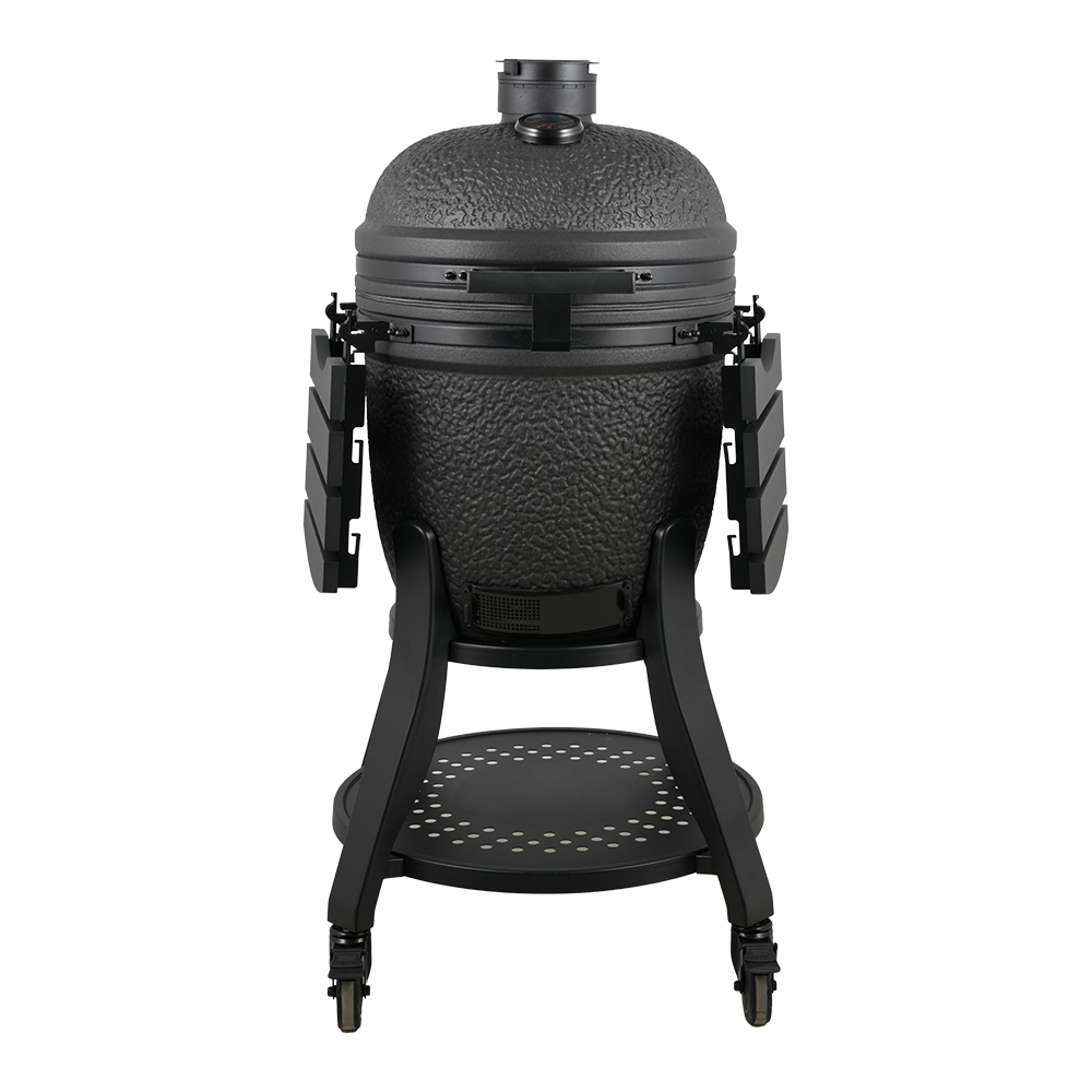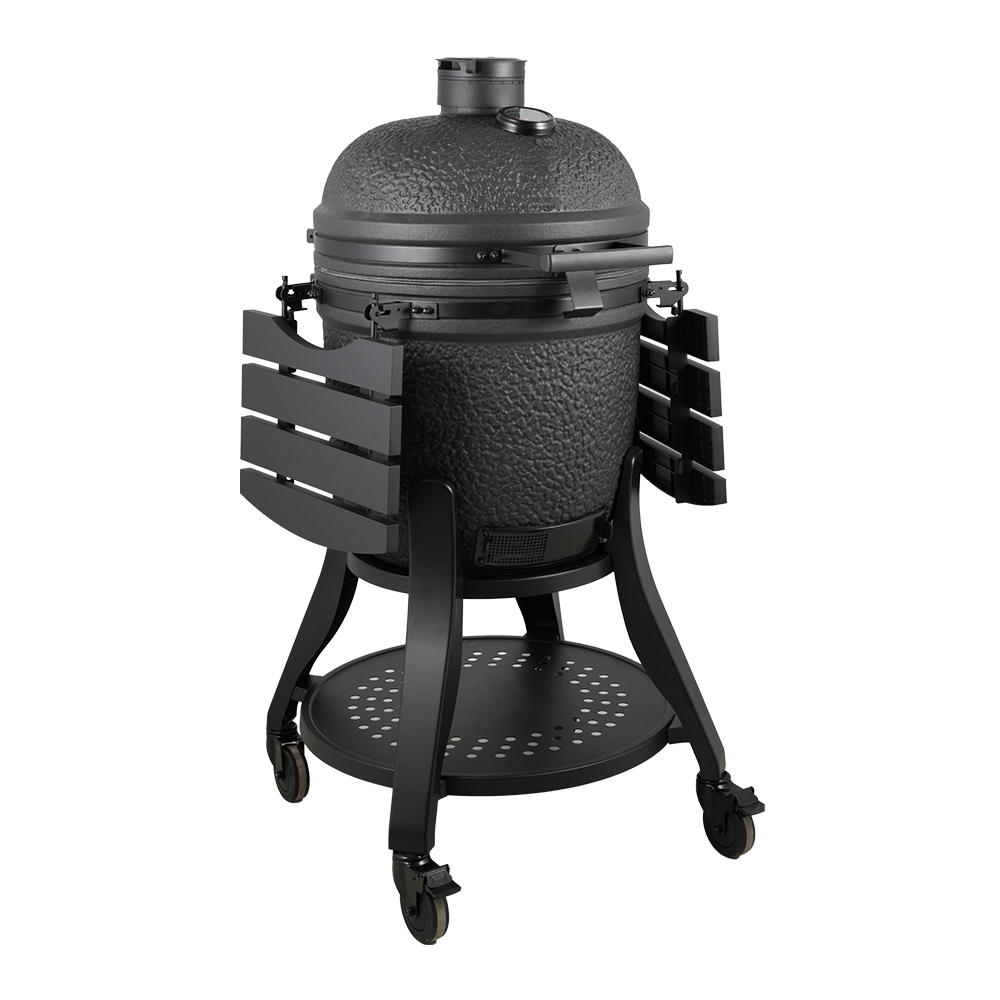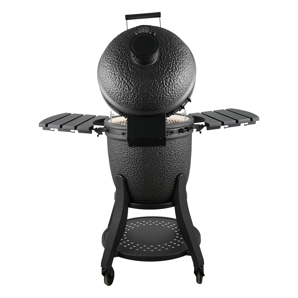 1. Special bubble glazing finish 2. Deluxe KJ stand with 4inch wheels 3. Cast aluminum side table, soft feeling plastic handle 4. Premium larger 80mm thermometer 5. Premium cast aluminum air vent 6. Black bottom went 7. Fiberseal gasket 8. Ceramic body with logo 9. Easy lift hinge system +locker Inside: 10. Duluxe divide conquer cooking system ( New 3 tirers system, 7mm thick square rod x2 half grid, x2 half moon double thick 24mm deflector,x2 half moon drip pan) 11. Double thick 24mmxlarger 380mm Diameter pizza stone 12. 1x cast iron half moon cooking grid, 1x cast iron half moon cooking plate 13. 6mm thick Charcoal basket with share +Ash drawer BBQ Accessories Pack: ( Total 58.4USD) 14. Chicken sitter with logo 15. Stainless steel pizza shovel with logo 16. Cleaning brush 17. Grill gripper 18. Cover with IQ GRILLS logo 19. Bluetooth Wireless digital thermometer 20. Black hot air charcoal lighter w